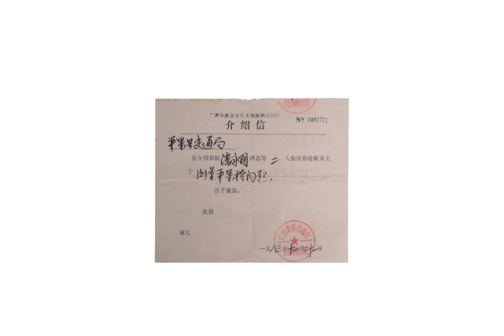 我院潘永图同志等二人于1983年11月前往平果县交通局联系关于测量平果桥问题的介绍信。
