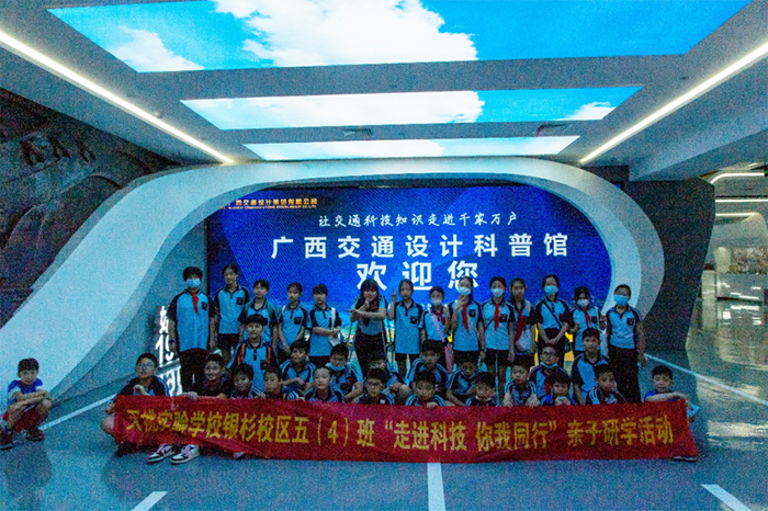 为了拓展广大青少年知识面,了解交通科技发展动态,培养学生科技创新意识,2022年6月11日上午,南宁市天桃实验学校银杉校区五(四)班到广西交通设计科普馆开展了以“走进科技•你我同行”为主题的亲子研学活动。