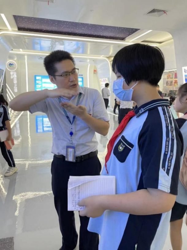 接着,全体师生和家长开启广西交通设计科普馆三大科普区的参观之旅。在交通规划勘察设计历史科普区里,大家认真细致地了解二十世纪60年代以来交通设计行业使用过的测绘、勘察、设计仪器设备,一张张珍贵的老照片将大家带回到当年交通建设的现场。每一件展品都激发着同学们的好奇心,一双双眼睛里蕴含着对知识的渴望,伴随着讲解员刘莹耐心细致的讲解,同学们飞速地在笔记本上记录着,仿佛在眼前的,不是一群五年级的少年,而是一个个未来的交通设计师,紧握着手中的笔,正描绘着未来世界中美好的交通蓝图……而陪同到现场的家长们,在讲解员生动的讲解过程中,也对交通科普知识产生了浓厚的兴趣,认真地和同学们一道听着讲解,不时就相关问题与讲解志愿者进行探讨与交流。